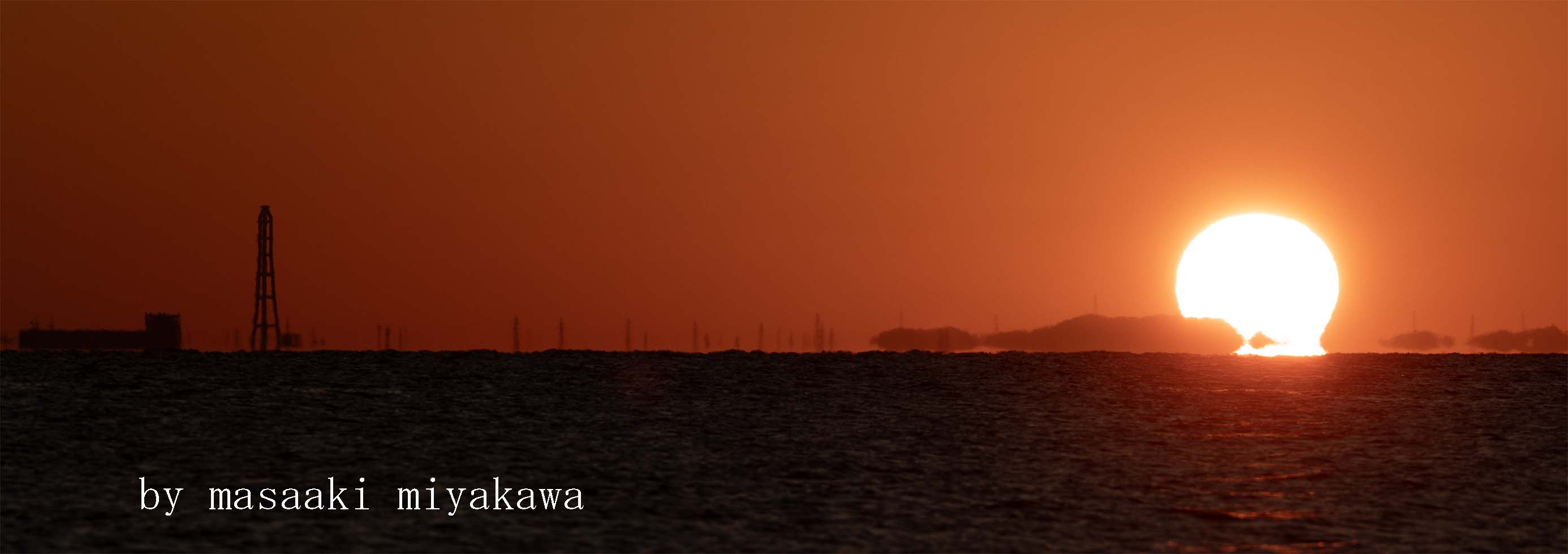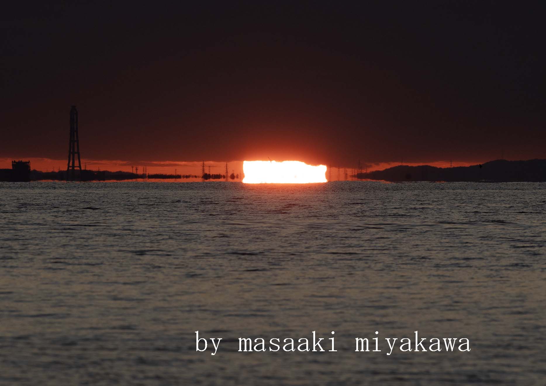 | 夕日 魚津市北鬼江より西南西18Km先 富山市草島火力発電所 発電所建屋に沈む太陽 上部 若干変形 令和7年11月29日(土) 午後4時31分 撮影:宮川政昭 |