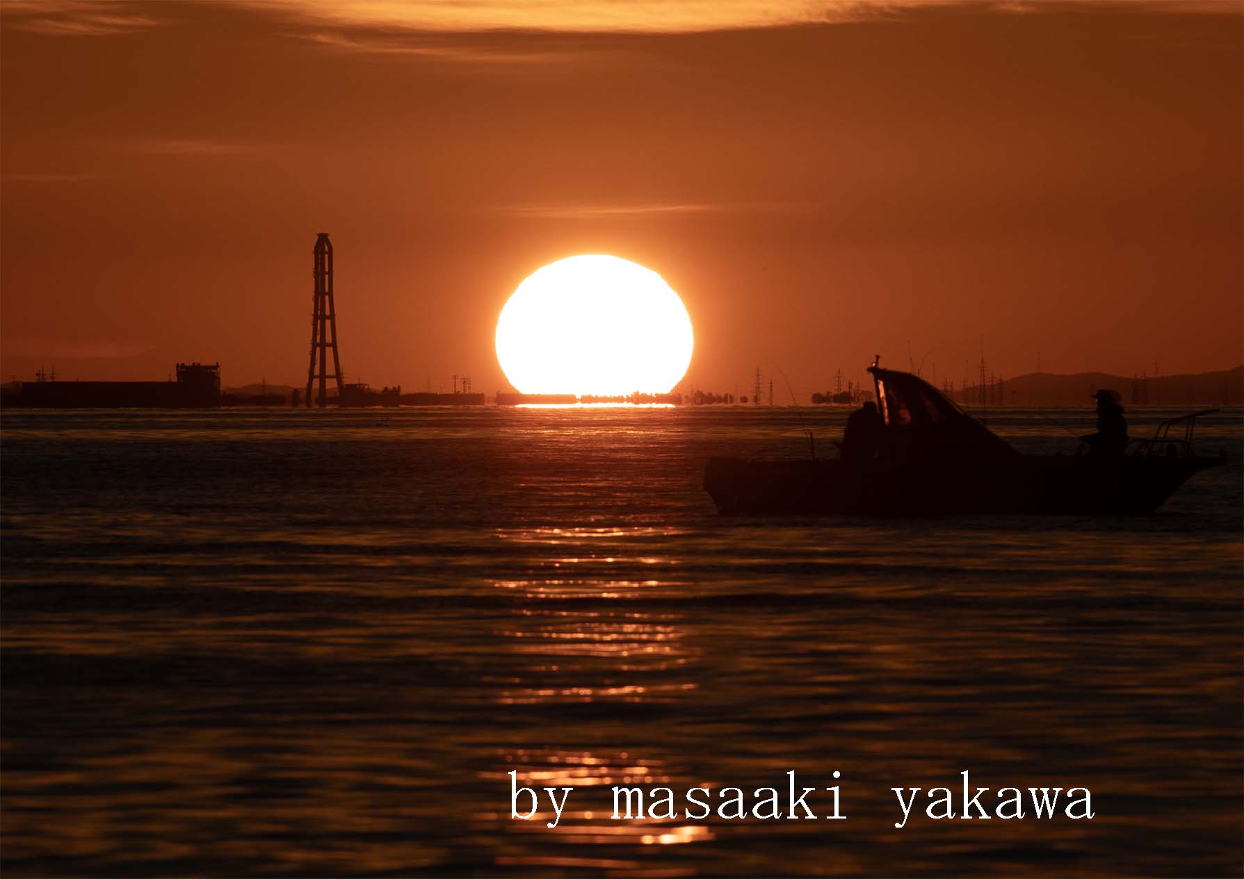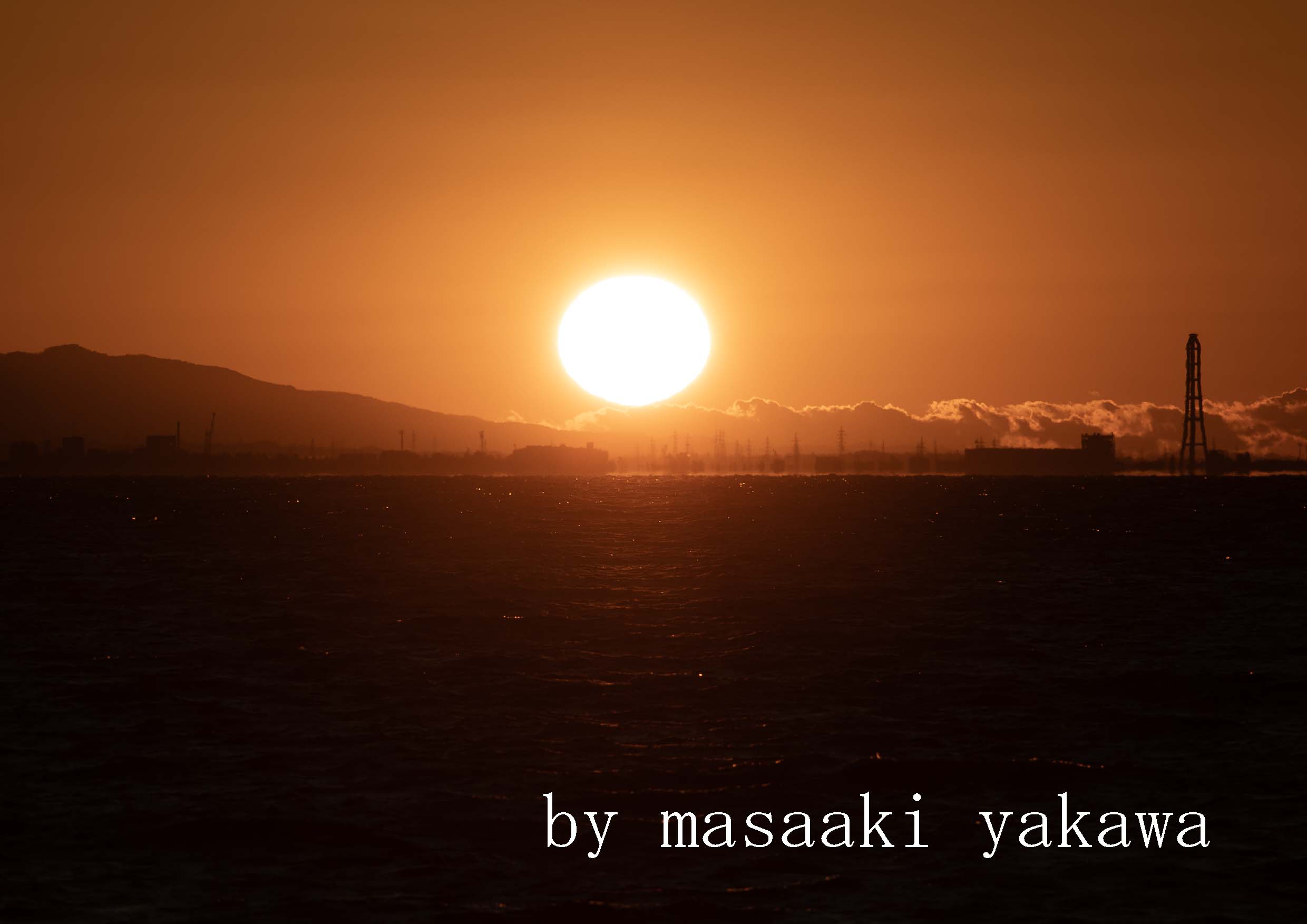| 夕日 魚津市北鬼江海岸より西49Km氷見市稲葉山付近 氷見市 新湊大橋(西 26Km)と氷見市堀江千石富山新港発電所の中間に夕日が沈む 令和7年10月24日(金) 午後4時58分 撮影:宮川政昭 |