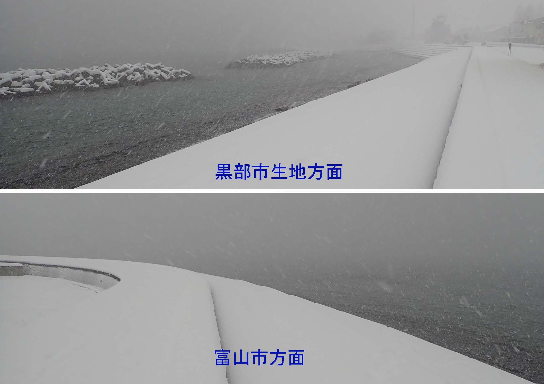 北鬼江より北7.4Km黒部市生地鼻灯台府近 雪の晴れ間 家々に積もった雪が