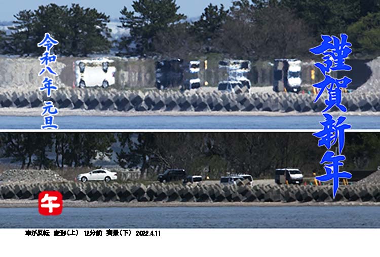 太陽に照らされ白く輝き 下に反転した像と重なり伸び変化 海岸高さで見え方が変化